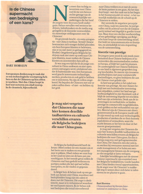 Zakelijke betrekkingen met de nieuwe Chinese supermacht zijn essentieel voor het Belgische bedrijfsleven. Goede banden met China bieden vooral opportuniteiten. En de angst voor ‘de Chinezen’ is makkelijk weg te nemen door zich beter te informeren en ter plaatse te gaan.